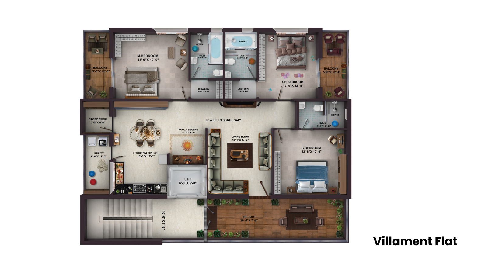 - Toilet/Utility Doors: 2”6ft x 7ft Engineered wood flush shutter, laminated on both sides, fitted with quality hardware.